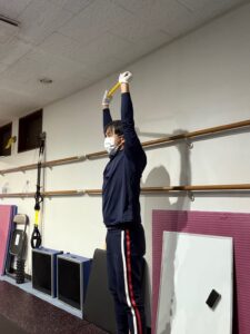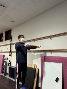 次に棒を上方にあげて立つ、そしてしゃがむトレーニングです。この時、出来るだけ自分の重心位置を下げないことが大切になります。