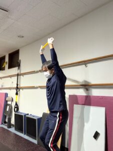 ⓷④棒をもって真下にしゃがむトレーニング